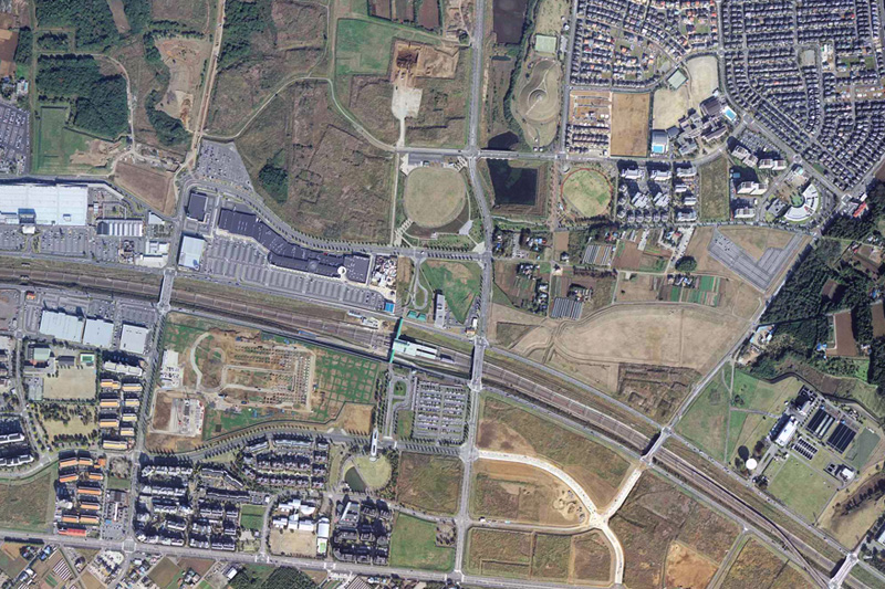 (国土地理院 地図・空中写真閲覧サービス CKT20064X-C2-25 を加工) 駅開業から11年。ようやく周辺の輪郭が整いつつあるが、まだまだ半分農村(笑)横浜のみなとみらいだって、最初はこんなものだった。