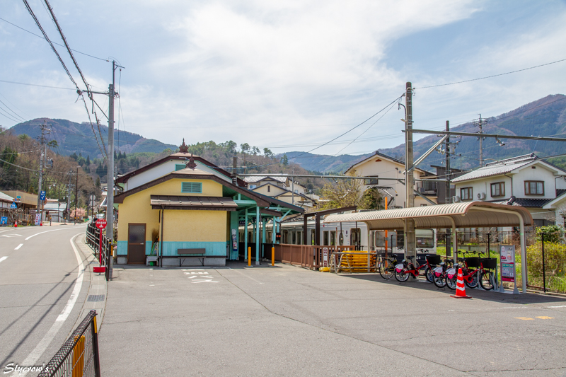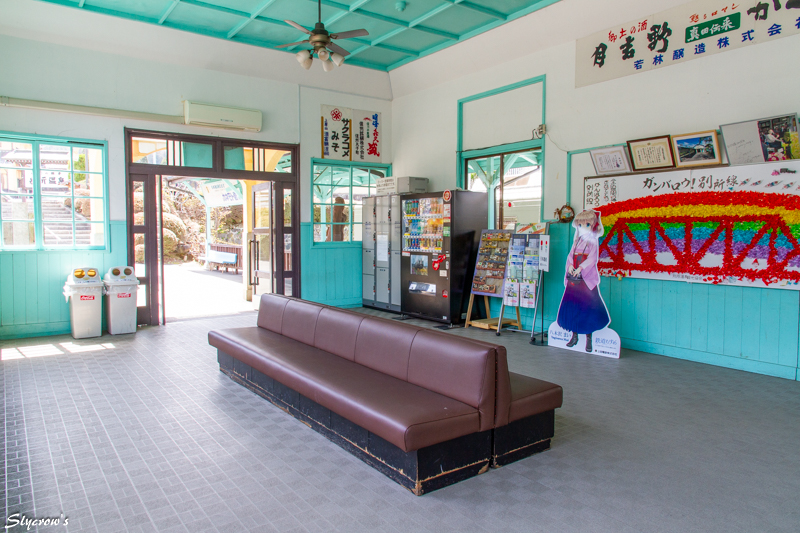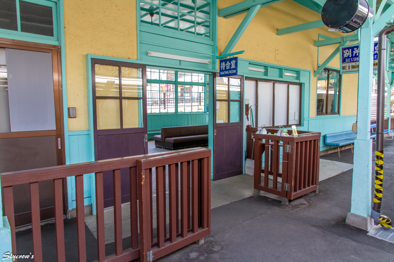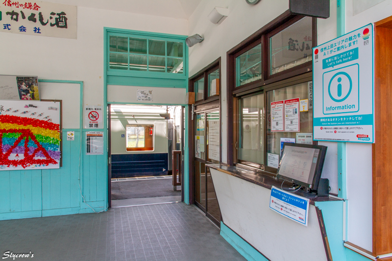 駅舎が現在の外観になったのは1950(昭和25)年。旧・上田丸子電鉄時代の社紋が残る。2022(令和4)年に無人化したが、窓口でのグッズ販売は無人後化も継続しておこなわれている。