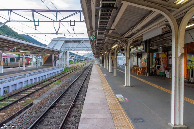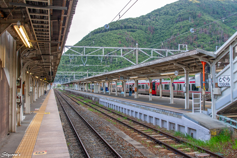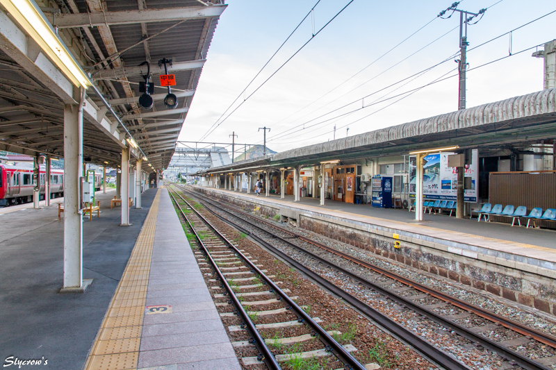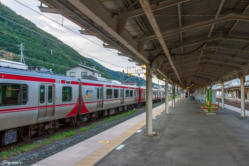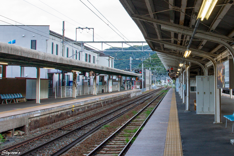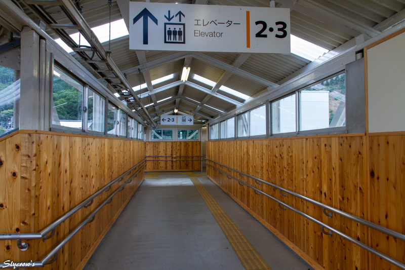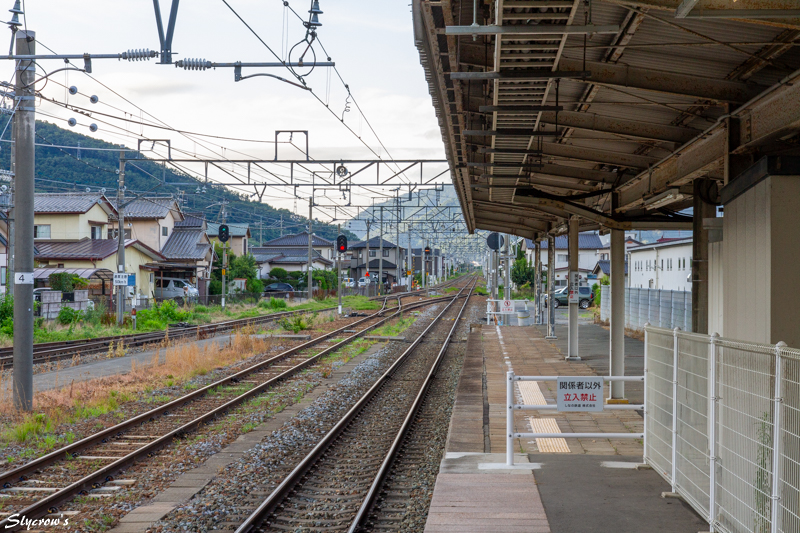 次駅は坂城で4.5km南に。当駅はエレベーターの設置はないが、車いすで2,3番ホームへ行く場合、駅員に申し出て、画像(ほぼ中央)にも見える構内踏切を使用できる。