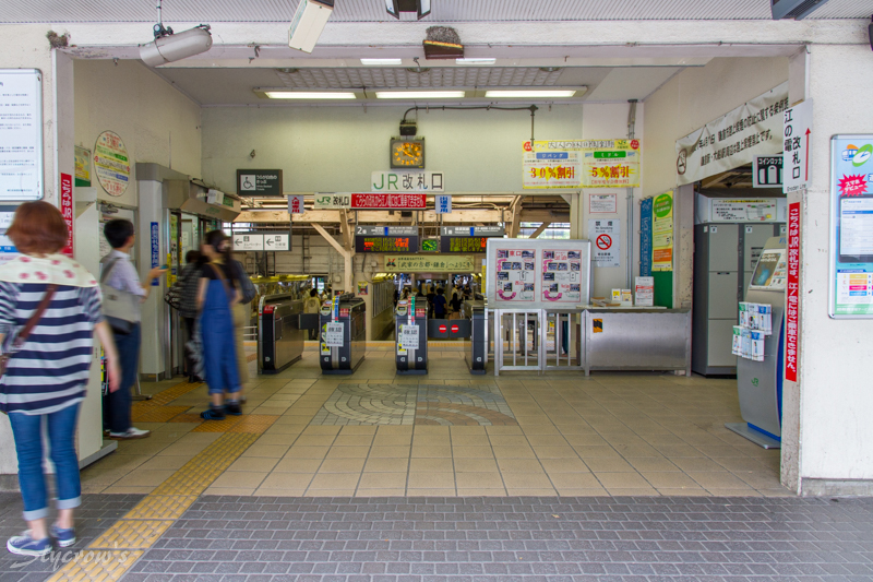 正面はJRの西口改札。 改札内を右へ進むと 江ノ電との連絡改札がある。