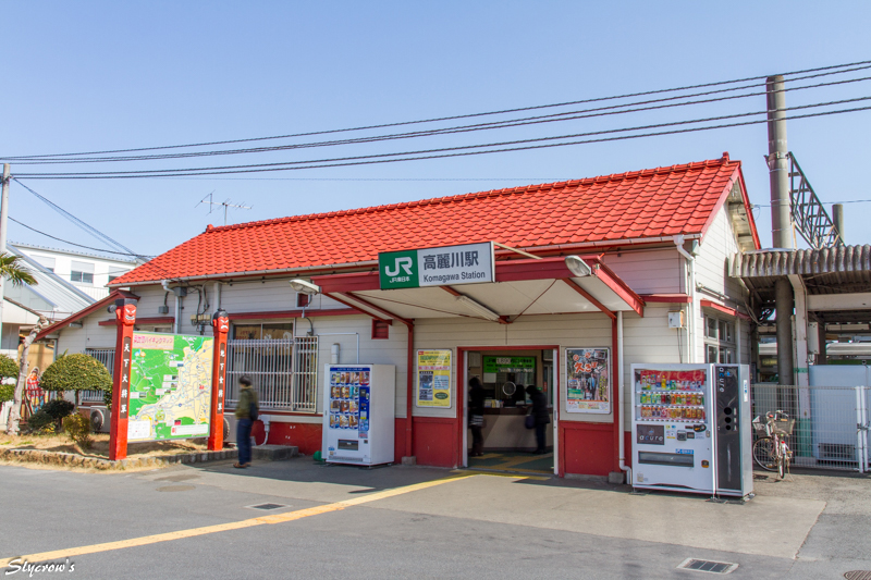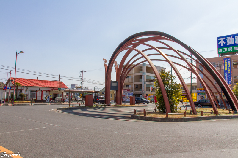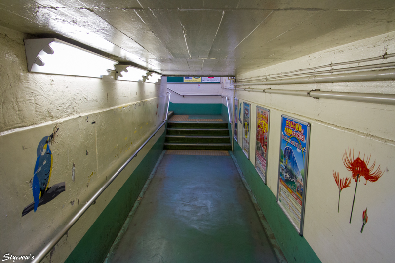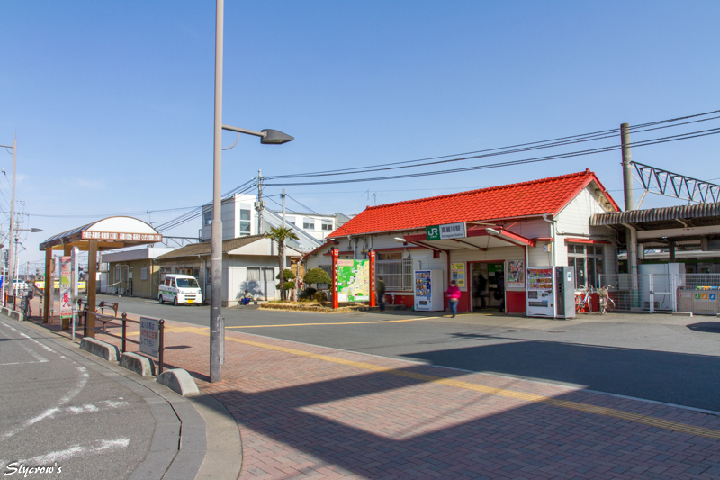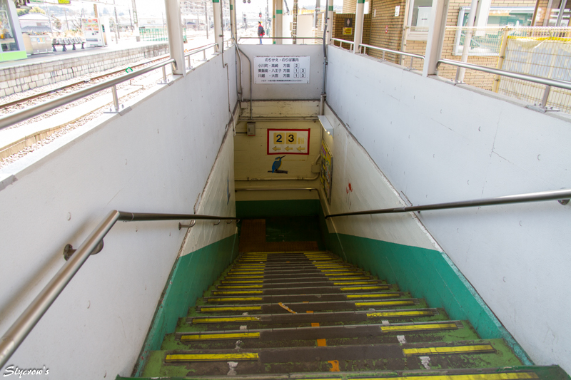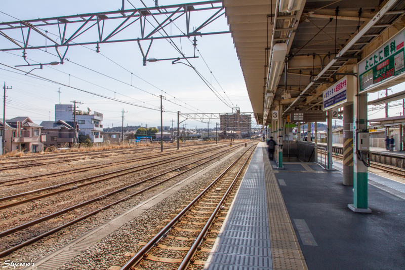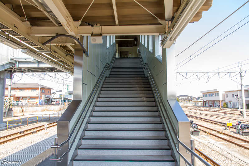 右側のスロープは車いす用。やや左にある立て看板?は「関東の駅百選」の選定駅であることが記載されている。