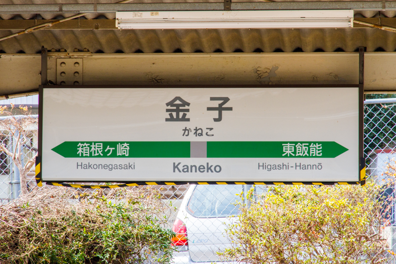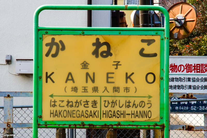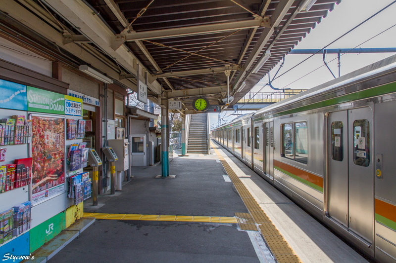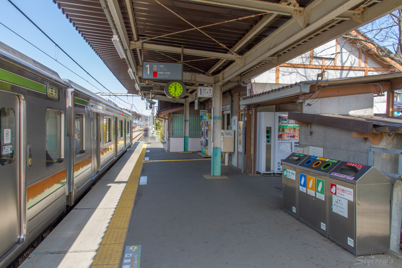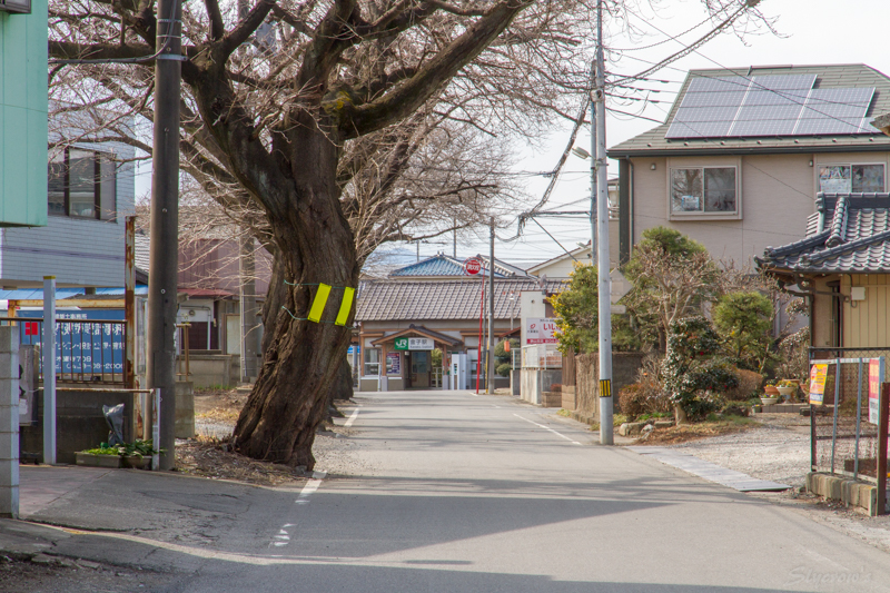 右側のスロープは車いす用。やや左にある立て看板?は「関東の駅百選」の選定駅であることが記載されている。