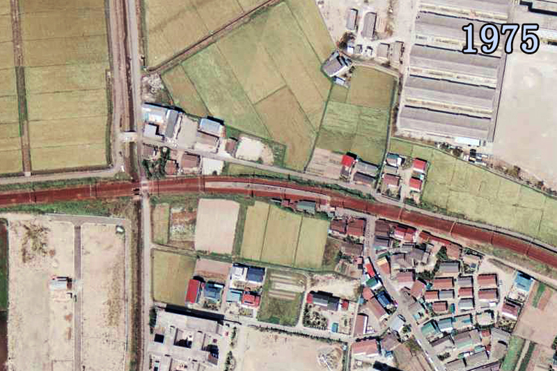 (国土地理院 地図・空中写真閲覧サービス CTO7528-C8-47 を加工)駅西側は今も変わらず耕作地が広がるが、駅北口周辺は団地や文教施設が展開し、住宅も増えてきた。写真右上は仙台高等技術専門学校で、現在も変わらずそこに所在する。