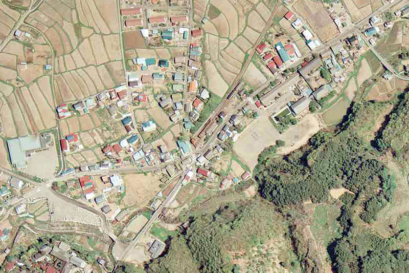 (国土地理院 地図・空中写真閲覧サービス CCB7513-C25A-26 を加工)現在、駐車場になっている駅構内東側だが、この当時どんなようすだったのかはこの写真では窺い知れない。保存車両はかつては2両だったとのことだが、たしかに現在と同じ場所に2両確認できる。もう1両は2011年に地元の高校へ移設されている。