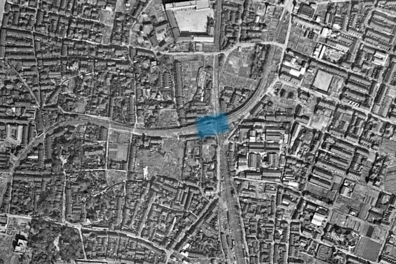 (国土地理院 地図・空中写真閲覧サービス USA-R443-No2-26を加工) 青マーカーが当停留場の位置。写真下部に南海の住吉東駅が見える。