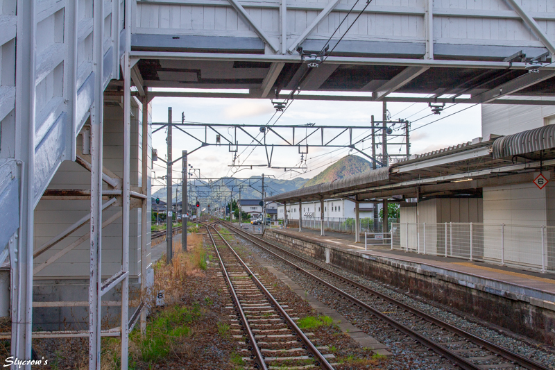 次駅は坂城で4.5km南に。当駅はエレベーターの設置はないが、車いすで2,3番ホームへ行く場合、駅員に申し出て、画像(ほぼ中央)にも見える構内踏切を使用できる。