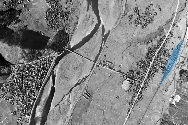 (国土地理院 地図・空中写真閲覧サービス USA-R618-51を加工)青マーカーが当駅。千曲川を渡ったらそこは温泉パラダイス(笑) 駅前と温泉街にしか人間は住んでないのではと思わせる。すでに80年近く前から、当駅の果たす役割ははっきりしていた。